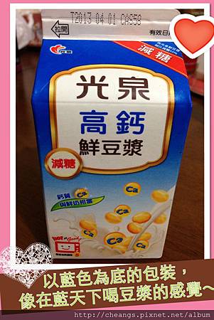 剛到超商買回「光泉質物奶高鈣鮮豆漿」的時候,覺得它的包裝以藍色為主要的底色,加上一顆顆部分寫了”Ca”的黃豆,讓人覺得很舒服、很喜歡,有一種在藍天下喝著好喝的豆漿的感覺 >///////< 。